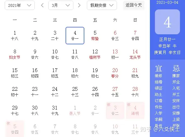 举例:今天,阳历为:2021年3月4日,阴历为:二零二一年正月廿一,干支历为:辛丑年庚寅月辛亥日,此时22点10分,为己亥时。今天是农历雨水的最后一天,明天交惊蛰。