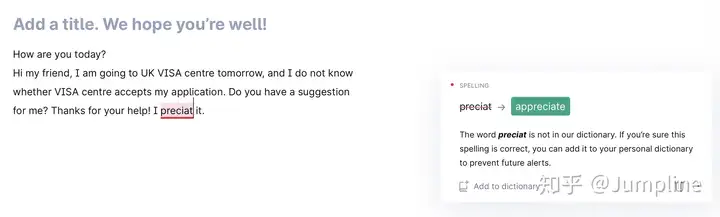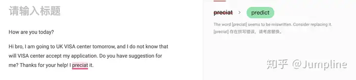3. Pitaya水果龙明显没有识别句子的语境,居然让我改成predict...,反之grammarly让我改成appreciate才是符合文中句子语境的。我不严谨得猜测水果龙的纠错语法就是单一的比对数据库中单词的字母拼写,因为preciat和predict拼写很像,而grammarly就对文章语境理解的很好。grammarly再次拿下人头。