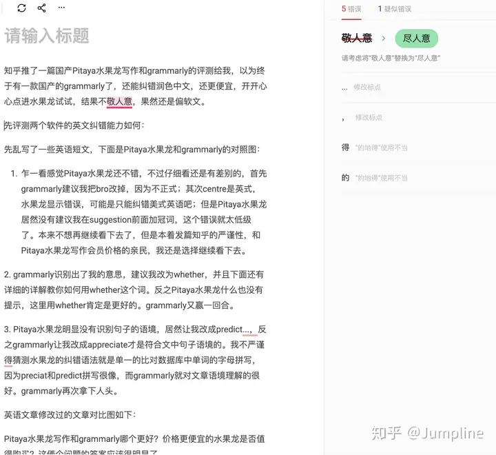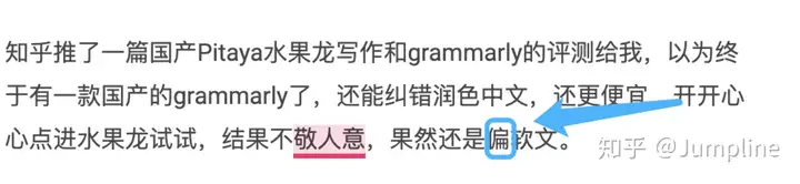 知乎推了一篇国产Pitaya水果龙写作和grammarly的评测给我,以为终于有一款国产的grammarly了,还能纠错润色中文,还更便宜,带着怀疑的态度点进水果龙试试,结果不敬人意,果然还是篇软文。
