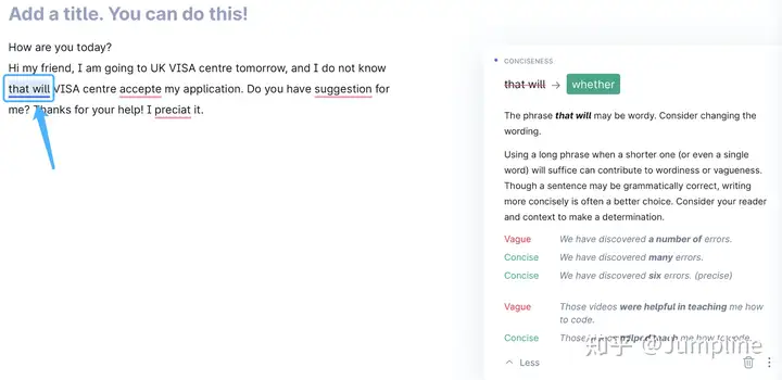 2. grammarly识别出了我的意思,建议我改为whether,并且下面还有详细的详解教你如何用whether这个词。反之Pitaya水果龙什么也没有提示,这里用whether肯定是更好的。grammarly又赢一回合。