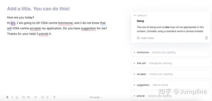 乍一看感觉Pitaya水果龙还不错,不过仔细看还是有差别的,首先grammarly建议我把bro改掉,因为不正式;其次centre是英式,水果龙显示错误,可能是Pitaya水果龙只能纠错美式英语吧;但是Pitaya水果龙居然没有建议我在suggestion前面加冠词,这个错误就太低级了。本来不想再继续看下去了,但是本着发篇知乎的严谨性,和Pitaya水果龙写作会员价格的亲民,我还是选择看完。
