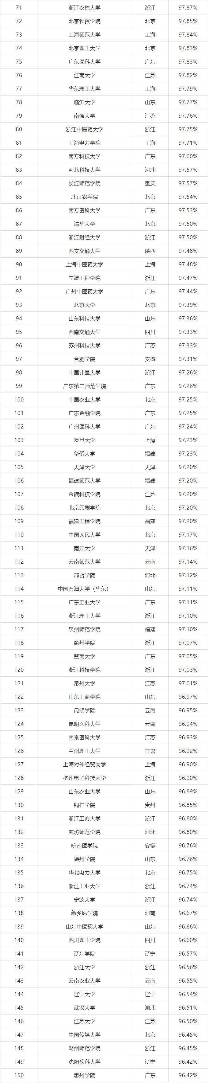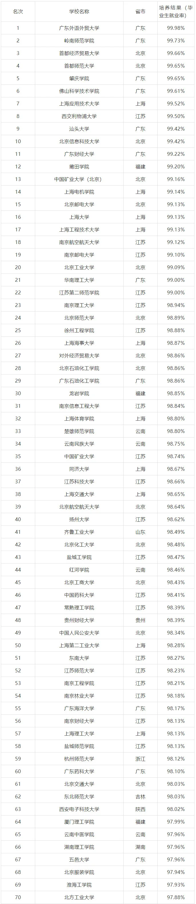 根据软科2018中国最好大学排名发布名单显示,高校培养结果统计名单中,广东外语外贸大学毕业生就业率高达99.98%问鼎榜首;岭南师范学院99.73%位列第二;首都经济贸易大学以99.66%位列第三;首都师范大学99.65%,列第四名;肇庆学院99.65%并列第四;佛山科学技术学院99.65%位列第五。这些高校无疑都是毕业生就业方面的翘楚。从榜单上省市区域来看,北京、上海、广州等地区的高校就业率更好,这也和当地经济发展状况密切相关。150强详细榜单如下,一起来看看吧!