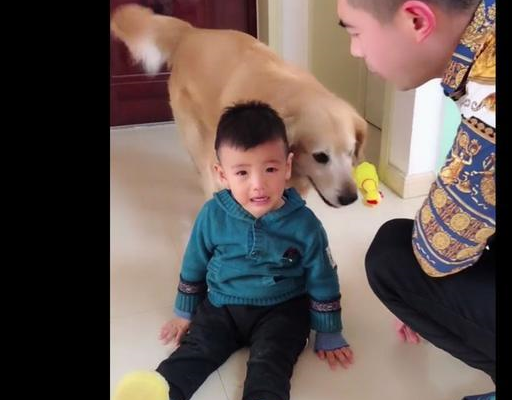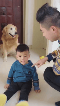 要打就让主人打金毛!小主人可不能轻易的受罚呀!主人打了几下金毛,金毛也一声不吭的护着小主人。