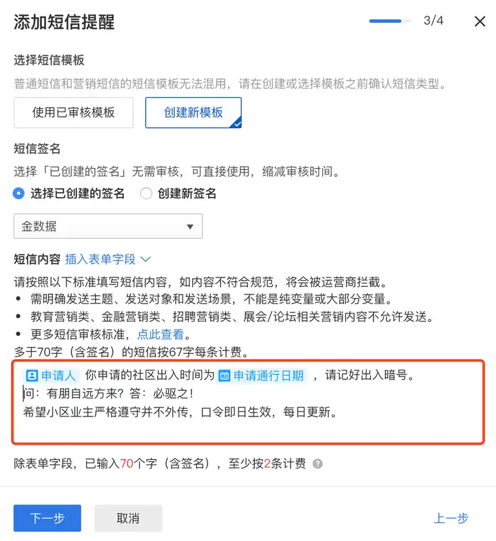 给每个填写表单的人员发送一条短信,短信内容为社区出入时间及出入暗号。防止串门、聚众,答不上来不让进。