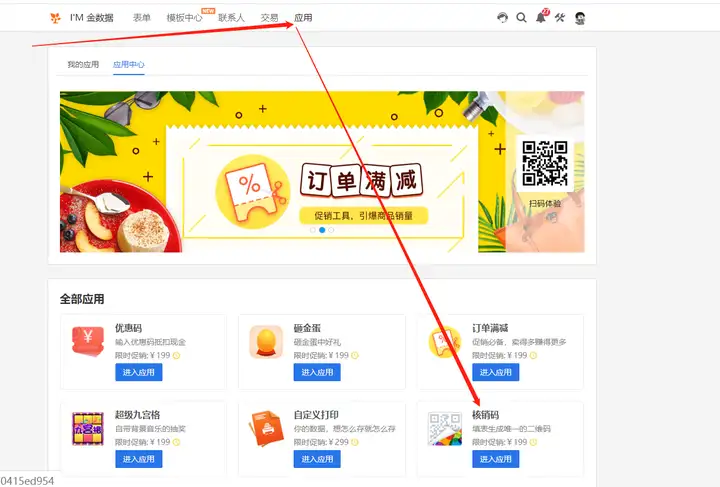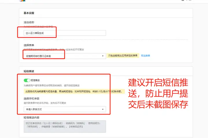 进入金数据应用中心-核销码应用,按照图示设置核销码,为了防止用户未保存截图建议开启短信提醒(开启短信提醒请注意账号内短信量情况)。