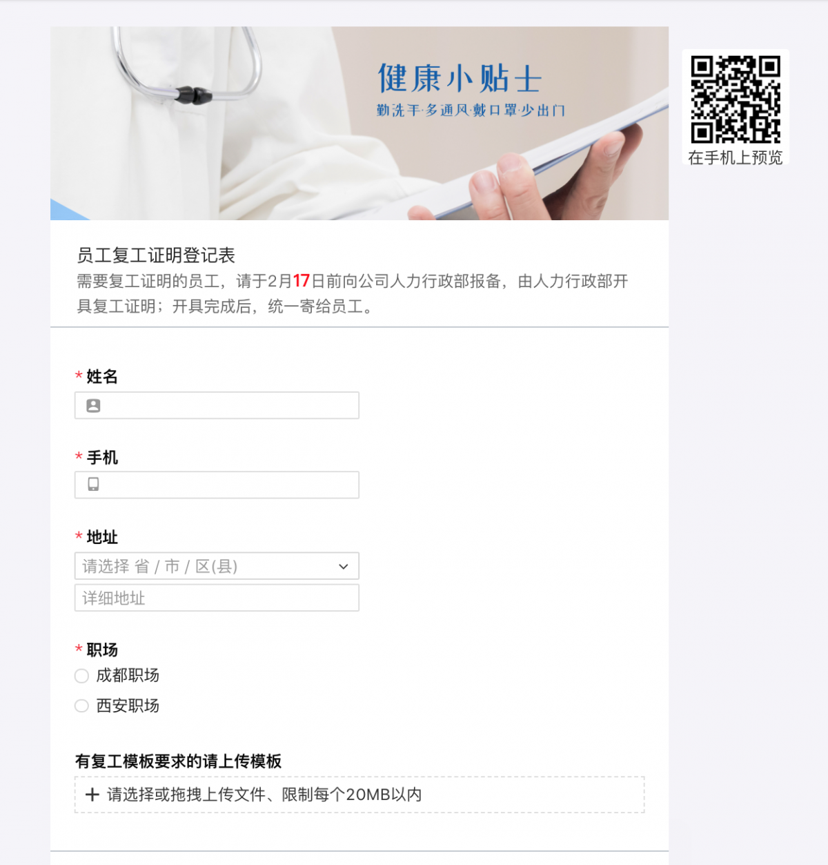 随着各地企业复工,大部分人员需要工作单位复工或务工证明、外出务工证明本人签字的出行保证书和已购火车票信息等信息才能顺利返工,各地要求不一,小金教你通过表单收集员工复工证明需求,在防疫优先的情况下,有序开展高效工作。
