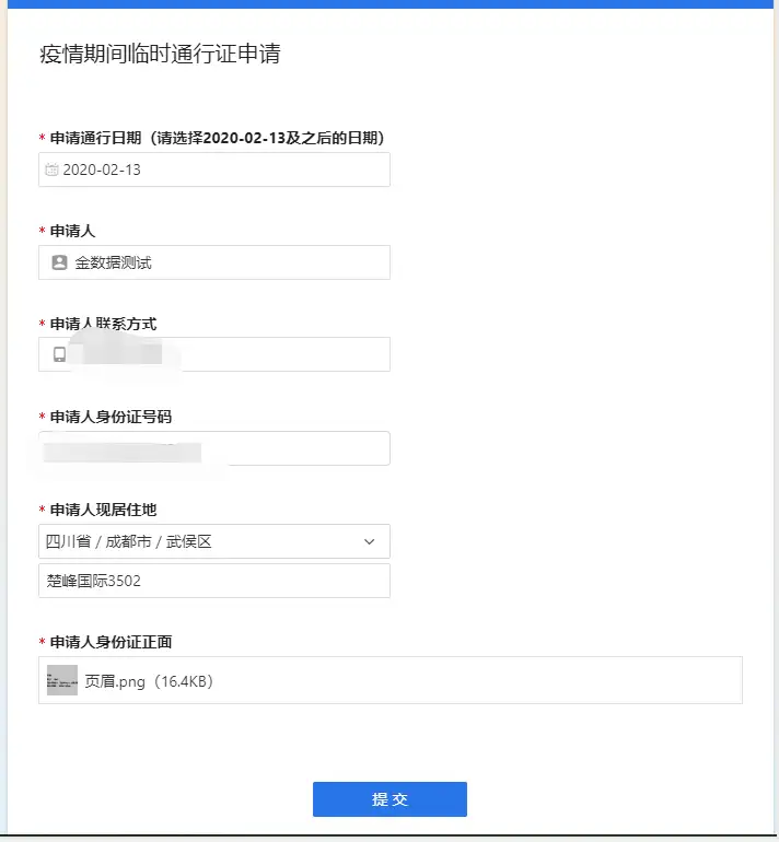 通过表单收集需要出入人员的姓名、手机号、身份证、住宅等信息,确认通行时间。