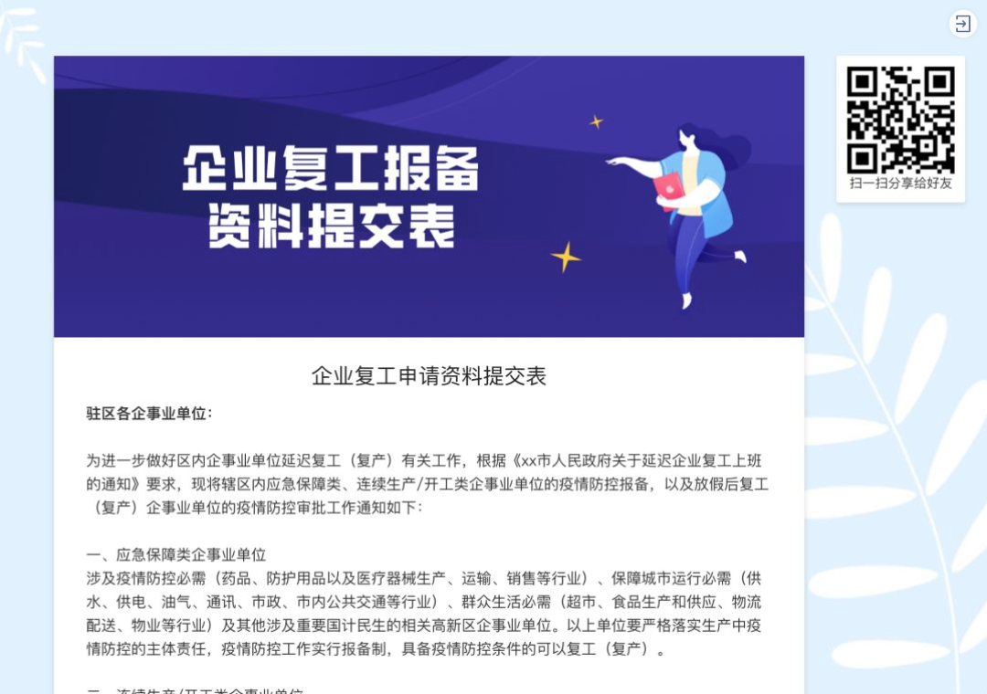 小金从复工出发,提供了一系列社区、企业可能会用到的表单模板,希望能为大家提供更安全有效的数据收集工作环境。