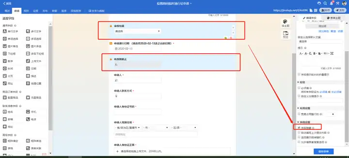 将需要申请出入证的人员必要信息进行收集;同时我们后台人员需要审核不需要让用户填写的内容就进行隐藏即可,如图所示。