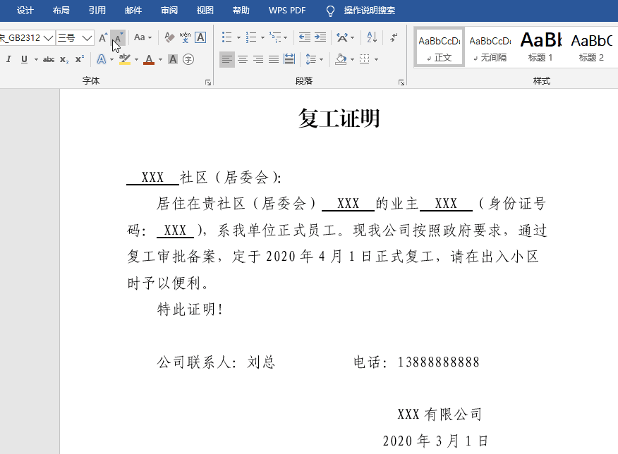 一、在Word中制作复工证明模板。