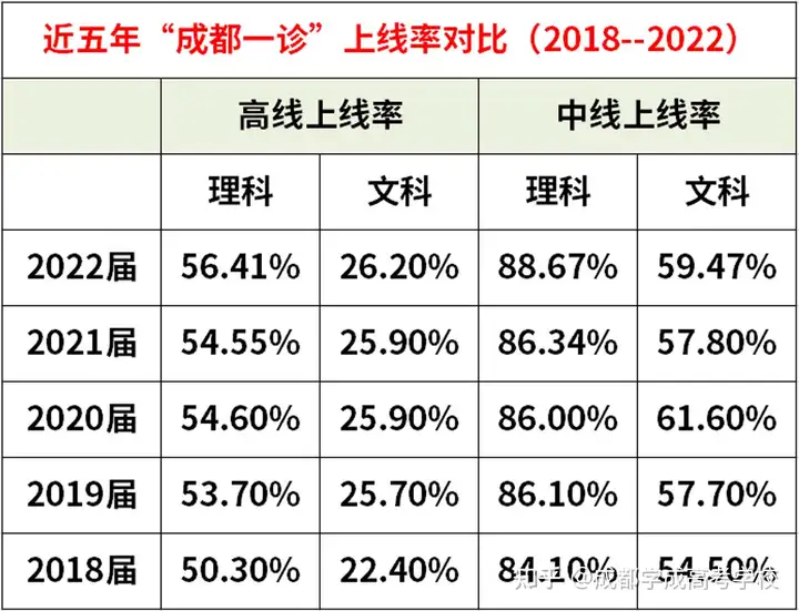 上线率能体现一个地区教育质量高低。【学成高考学校】整理成都一诊近五年上线率对比,让考生和家长更能直观看到一本和本科上线概率的高低。