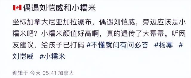最近,有网友发文称在加拿大偶遇刘恺威带9岁女儿外出,并在社交平台上分享了偶遇图。照片中,小糯米身高已经到了刘恺威胸口位置,穿搭也很有自己的风格,而且,父女俩还穿了亲子鞋,引发热议。