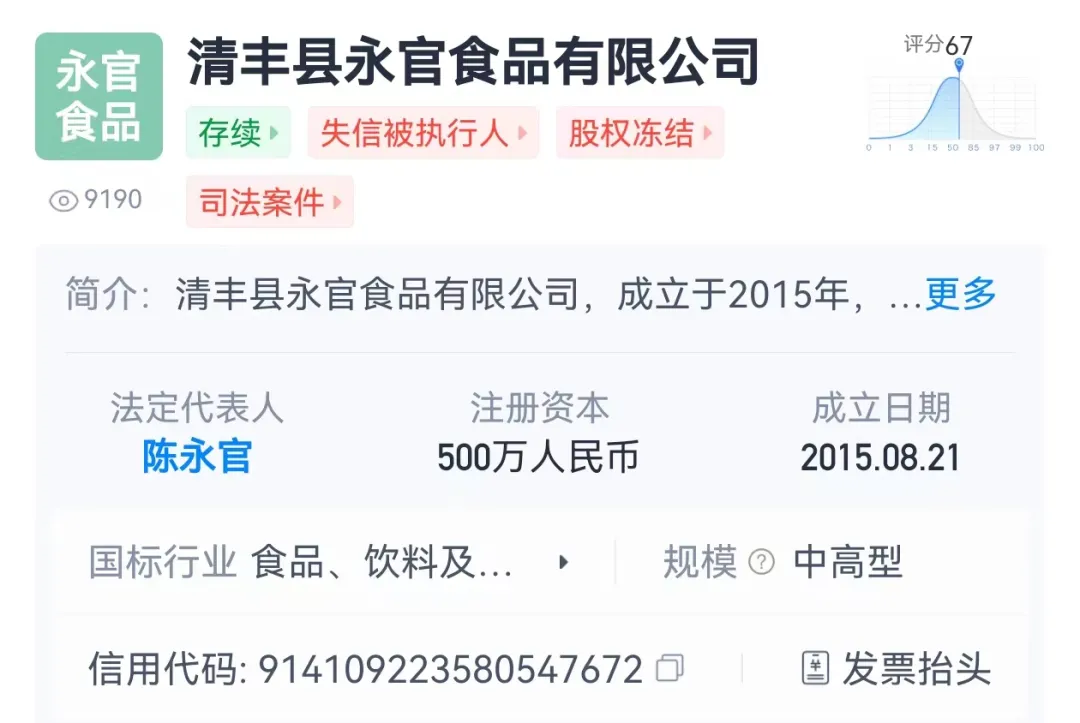 天眼查App显示,清丰县永官食品有限公司成立于2015年8月,法定代表人为陈永官,注册资本500万元,由陈永官全资持股。经营状况显示,该公司在抽检中曾多次被发现问题。天眼风险信息显示,该公司曾因环保问题被罚款7050元,此外,该公司已3次被列为失信被执行人(老赖)。