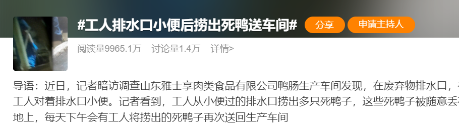 滨州的山东雅士享肉类食品有限公司鸭肠车间里,经过去污、刮油后的鸭肠被随意摆放在地上,与洗地污水混在一起,之后经过简单过水搅拌、分装冷冻,就被打上“免洗”的标签,销售至多个省份。此外,该公司生产车间环境脏乱差,并将掉入混有鸭毛、污染物的排污渠内的死鸭,捞出后重新挂回生产线等问题。而这条排污渠,甚至还有工人朝里撒尿……