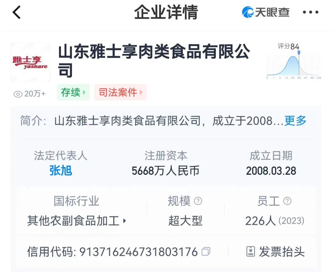 山东雅士享肉类食品有限公司成立于2008年3月,法定代表人为张旭,注册资本5668万元,由山东雅士享牧业集团有限公司全资持股。风险信息显示,该公司在抽检中曾多次被发现问题并责令改正。此外,该公司曾多次因环保问题被处罚,处罚总金额超20万元。
