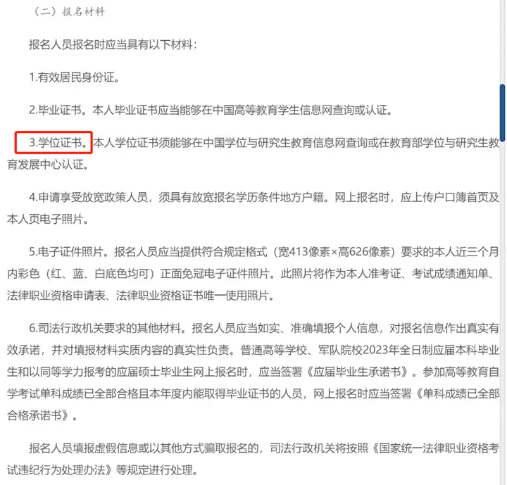 司法行政机关要求的其他材料。报名人员应当如实、准确填报个人信息,对报名信息作出真实有效承诺,并对填报材料实质内容的真实性负责。普通高等学校、军队院校2023年全日制应届本科毕业生和以同等学力报考的应届硕士毕业生网上报名时,应当签署《应届毕业生承诺书》。参加高等教育自学考试单科成绩已全部合格且本年度内能取得毕业证书的人员,网上报名时应当签署《单科成绩已全部合格承诺书》。