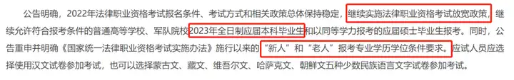 司法部公告中明确提出:2022年法律职业资格考试报名条件继续施行“老人老办法、新人新办法”