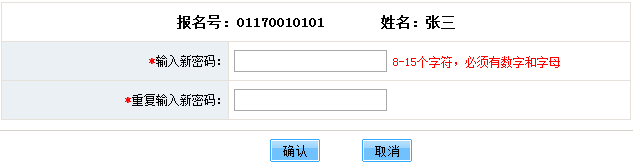考生输入新密码、重复输入新密码,两次密码输入必须一致。新密码必须为数字和字母的组合,长度为8—15位。输入后点击“确认”按钮,修改成功后返回登录页面。