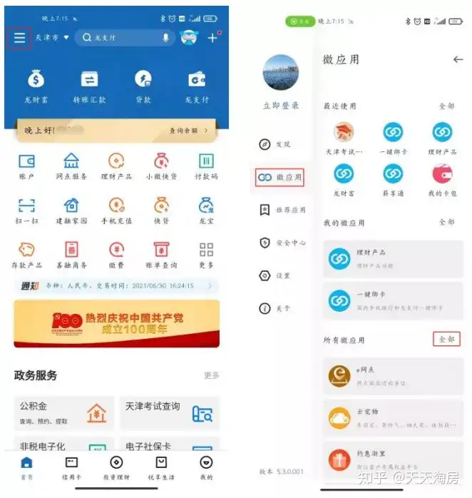 登录建设银行手机银行APP后,可通过“政务服务”或“微应用”两个入口进入“天津考试查询-中考成绩查询”功能,即可进行查询。