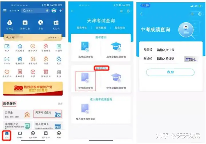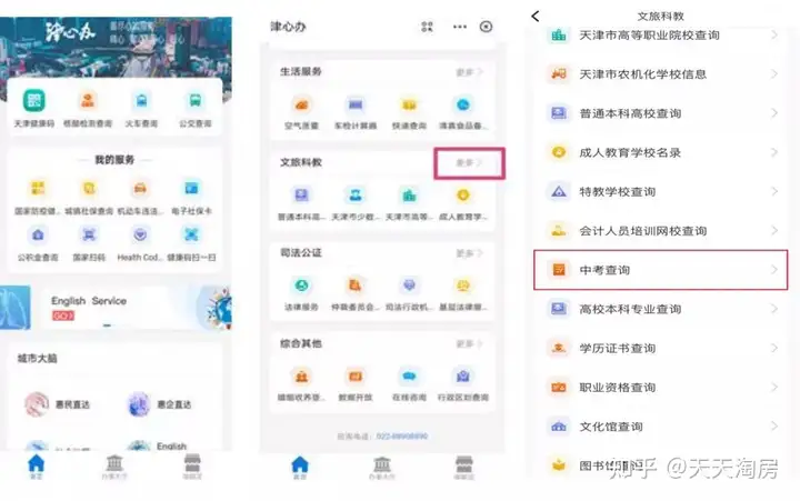 登录“津心办”APP、“津心办”支付宝小程序,在“文旅科教”服务中找到功能查询入口,点击“中考查询”专区,进入查询页面,即可进行查询。