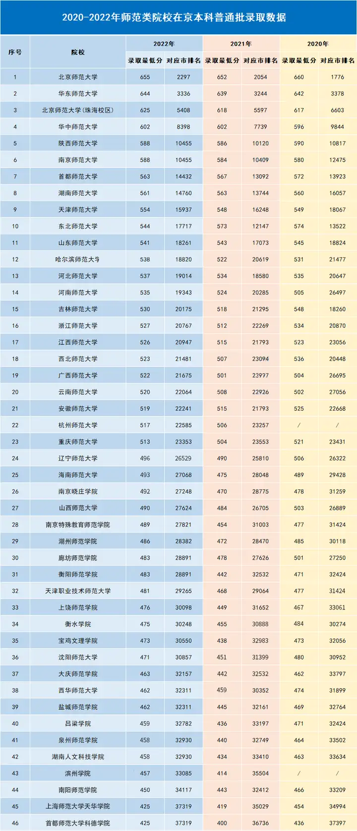 下表整理了师范类院校2020—2022年在京本科普通批录取最低分及市排名:(不含中外合办专业)