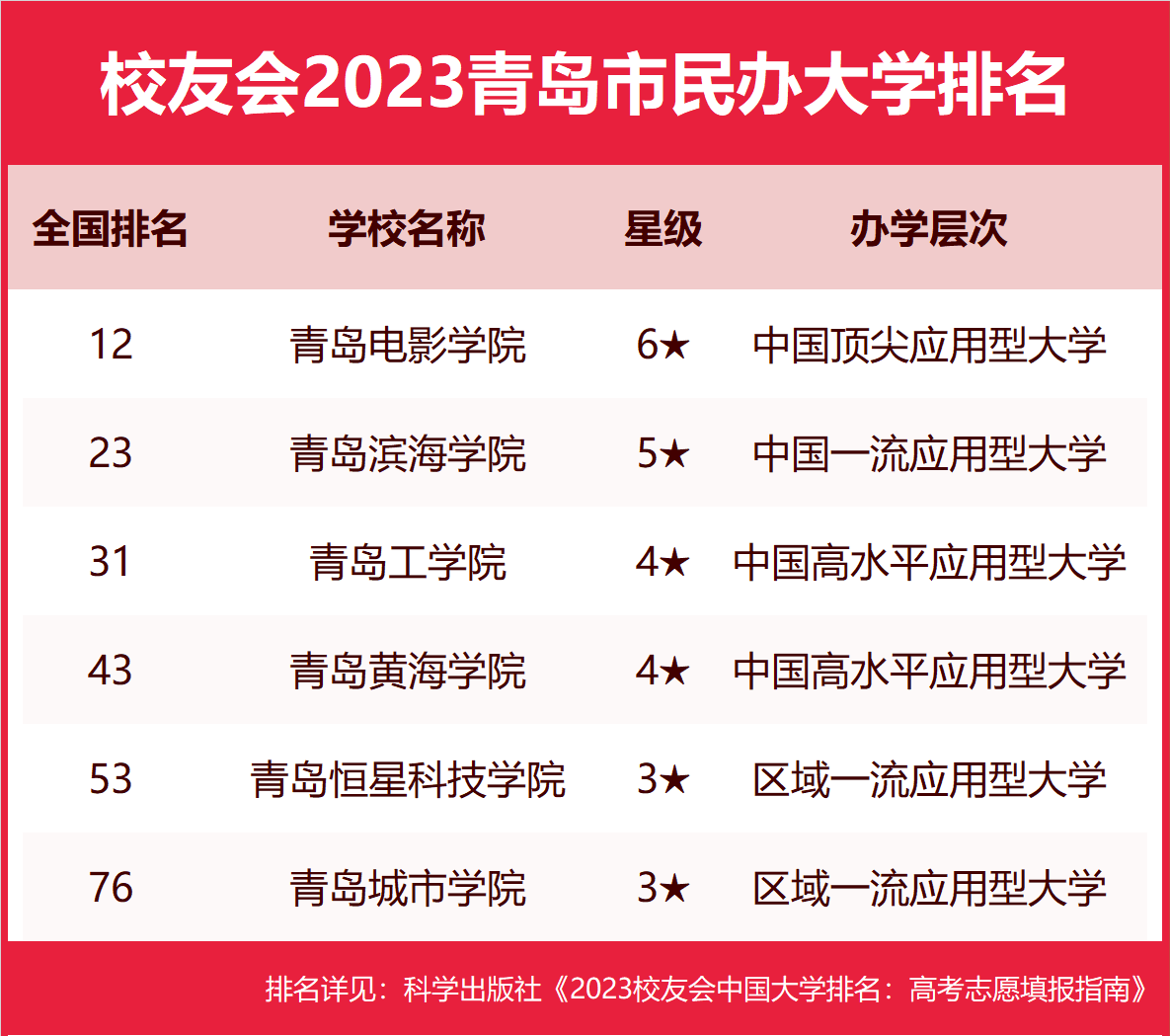 在最新校友会2023中国民办大学排名中,青岛电影学院办学实力最强、最具竞争力、办学水平最高,全国排名第12名,稳居校友会2023青岛市民办大学排名第一。青岛滨海学院位列全国第23名,位居第2名。青岛工学院排行全国第31名,名列第3名。青岛黄海学院排名全国第43名,位列第4名。青岛恒星科技学院位列全国第53名,排名第5名。青岛城市学院排名全国第76名,排名第6名。