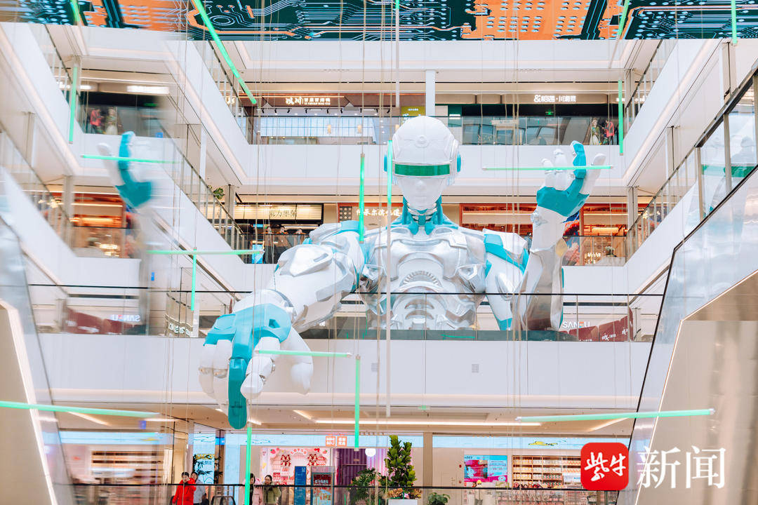 坐落在S3号线贾西站地铁口的“巨无霸”商业体雨花万象天地人头攒动,它的商场中心有个巨大的凌空机器人雕塑,配上悬挂的绿色条灯,引得市民纷纷打卡。不少网友都说:“整出了赛博朋克般的高级画风。”记者了解到,27日商场正式开业后,机器人还会与你互动哦。