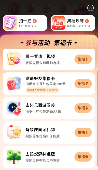 今年还联动了支付宝“碰一下”新功能、支付宝游戏中心、支付宝小荷包、祈福直播等专区,增加了多种集福卡渠道。
