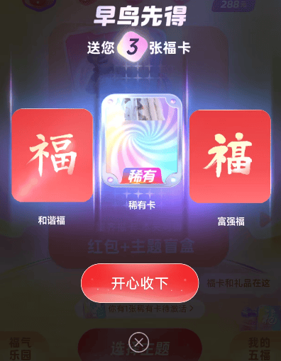 结果,一进去首页,开局就送了她3张福卡,还有一张稀有卡?往年,稀有卡不得搞个10分钟吗?怎么今年上来就送,不是难度又降低了?