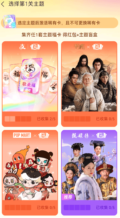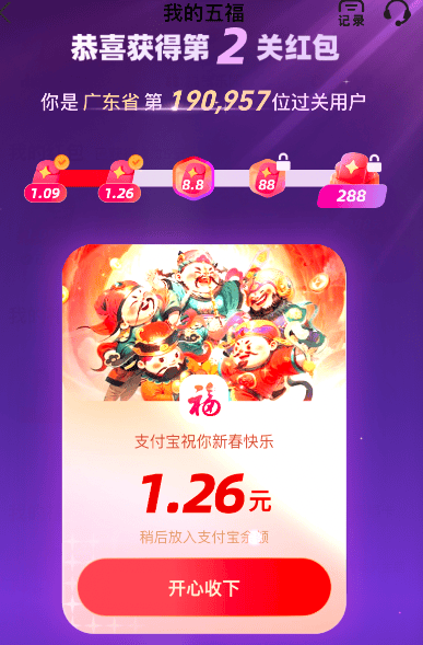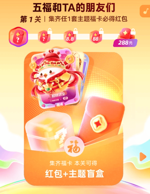 官方这次把集五福改成了关卡形式,一共5关,每一关都对应1套福卡,每一关集齐立马开奖。