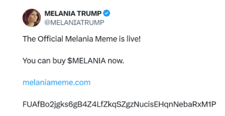 随着“特朗普币”的火爆,特朗普的妻子梅拉尼娅也趁势推出了自己的加密货币——梅拉尼娅币(Melania),即所谓的“第一夫人币”。