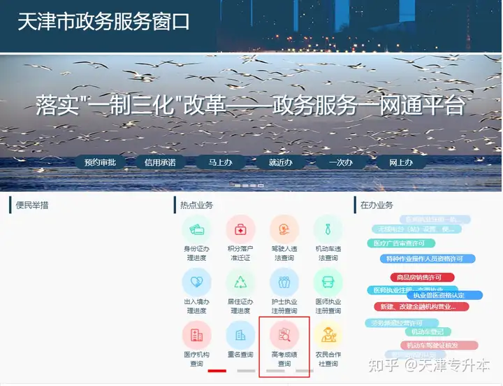 3.登录全国一体化在线服务平台,在天津政务窗口,点击“高考成绩查询”服务。