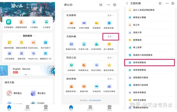 4.登录“津心办”APP、“津心办”小程序,在“文旅科教”服务中找到功能查询入口,点击“高考成绩查询”专区,进入查询页面。