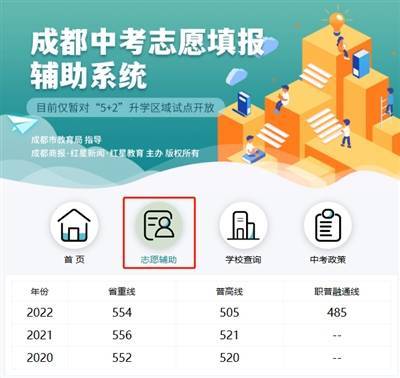 为给考生和家长在志愿填报时提供更多方便,成都市教育局上新了一系列惠民便民新举措,其中,委托成都商报·红星新闻·红星教育开发“成都中考志愿填报辅助系统”,将免费为考生填报志愿提供参考建议和信息查询。“成都中考志愿填报辅助系统”作为今年全市中考线上咨询和志愿辅助的部分,不仅能够为考生匹配自身分数上下的目标参考学校,一键查询近三年各个学校的录取分数,一目了然看清录取分和划线分之间的分差,以及各个学校近三年的录取趋势,还能实现考生、家长与学校的在线交流,实时对话,以此来解决广大考生志愿填报过程中急难愁盼的问题。