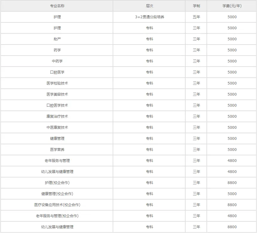 潍坊护理职业学院各专业学费