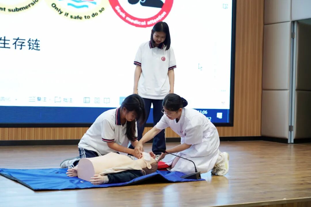 在溺水救护讲解环节,何冰老师通过PPT、模拟人演示等方法重点讲解了智慧救援的方式方法、心肺复苏术和AED的使用等应急救护技能,现场学生精神高涨、互动活跃。