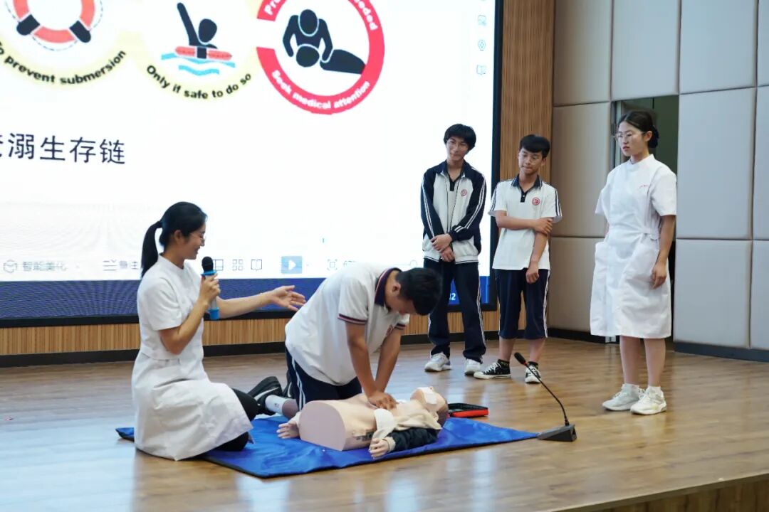 在救护技能演练环节,志愿服务队队员们手把手、点对点地指导学生们练习心肺复苏术和AED的使用,并详细说明了操作的注意事项,帮助学生们在溺水急救时正确施救。