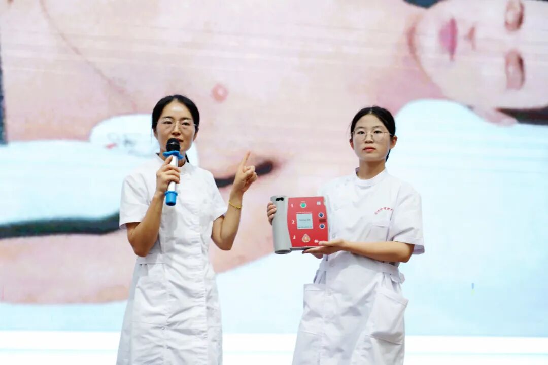 在溺水急救展示环节,22级护理系学生张娜身着护士服,在“模拟人”面前呼救、评估、通气、按压,沉着冷静、动作娴熟,展现了潍坊护理职业学院大学生良好的精神风貌和学院高水准的教学成果。