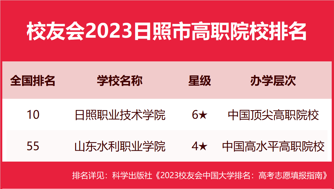 在最新校友会2023中国高职院校排名中,日照职业技术学院办学实力最强、最具竞争力、办学水平最高,全国排名第10名,夺得校友会2023日照市高职院校排名第一。山东水利职业学院位列全国第55名,名列第2名。