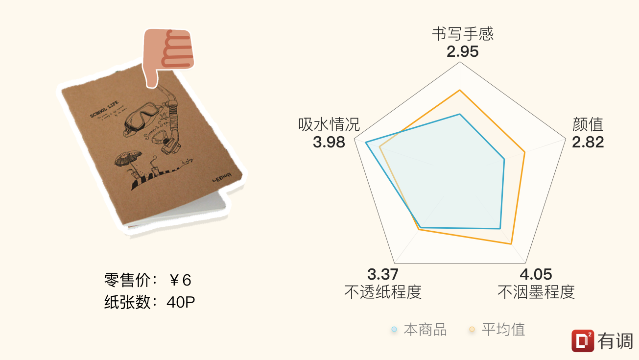 这款联华牛皮纸笔记本价格也同样的低廉,但它作为一款纸品并没有守住笔记本的基本尊严,各维度表现较差,和下面的得力同属垫底水平。