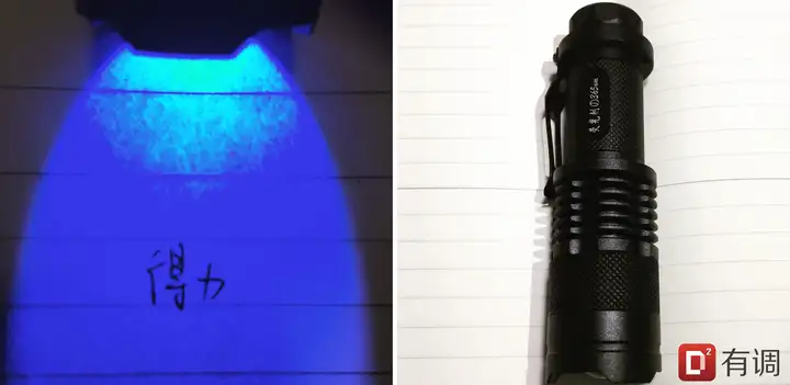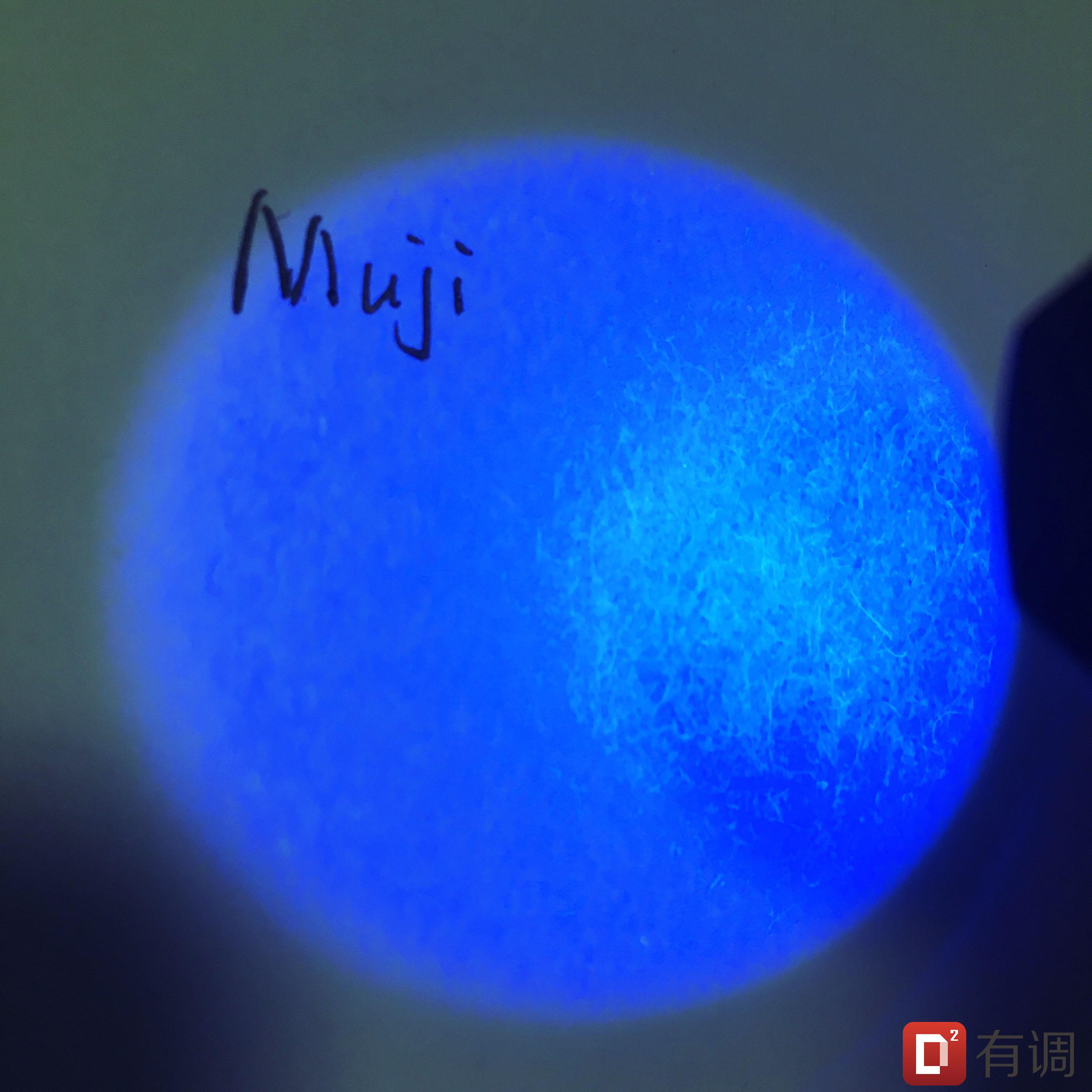 指纸张的荧光剂含量。在这里我们使用荧光检测手电筒进行了直观的检测,并发现有些笔记本的确含有较多的荧光剂。