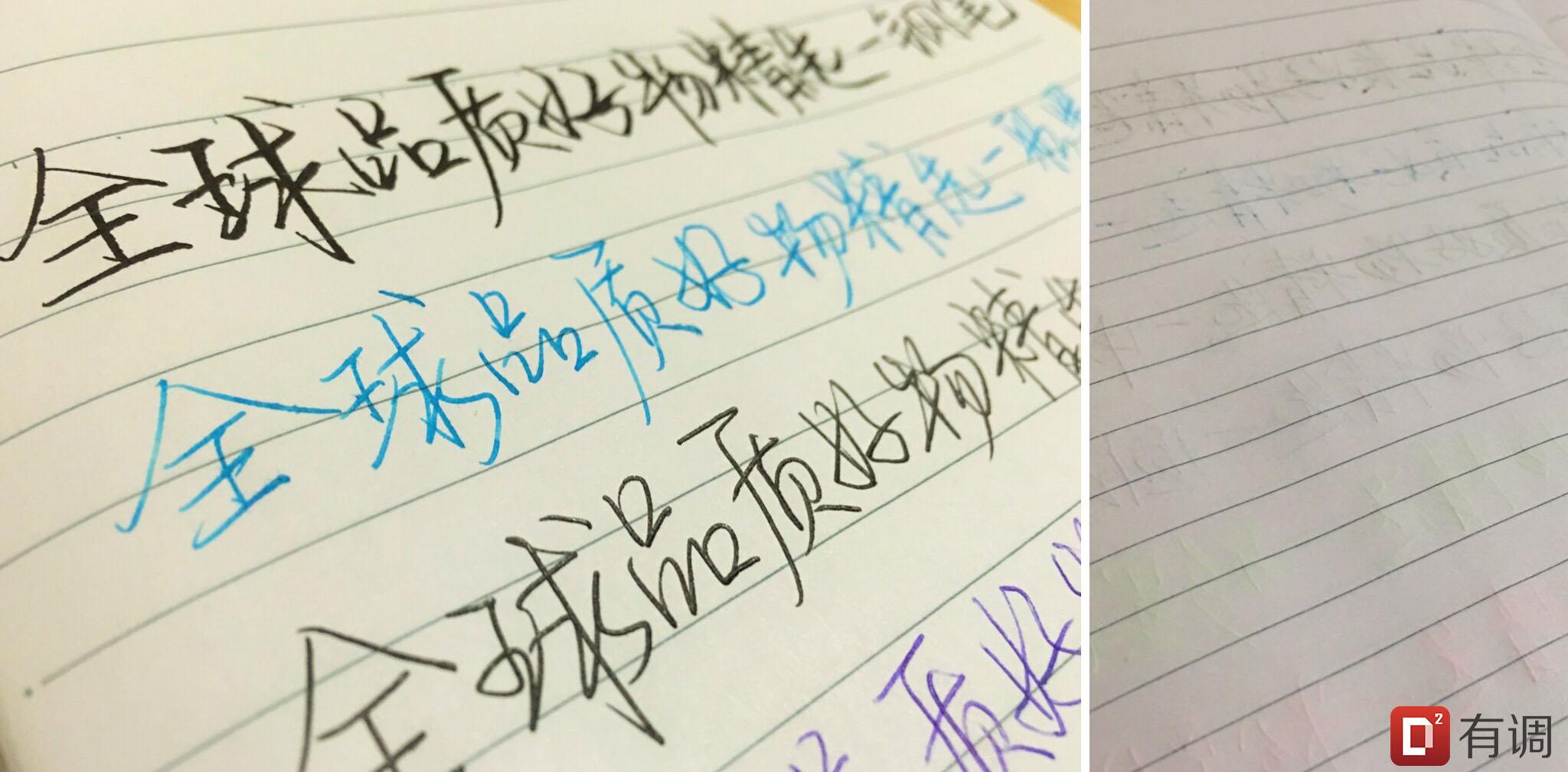 「山犬」:都能通过下一页看见上一页的字迹,但只有荧光笔和马克笔透墨,马克笔会在下一张纸留下一点点足迹,但不多。因此对于追求生活品质的我们来说,虽然它价格亲民,但也要坚决地对它say no。