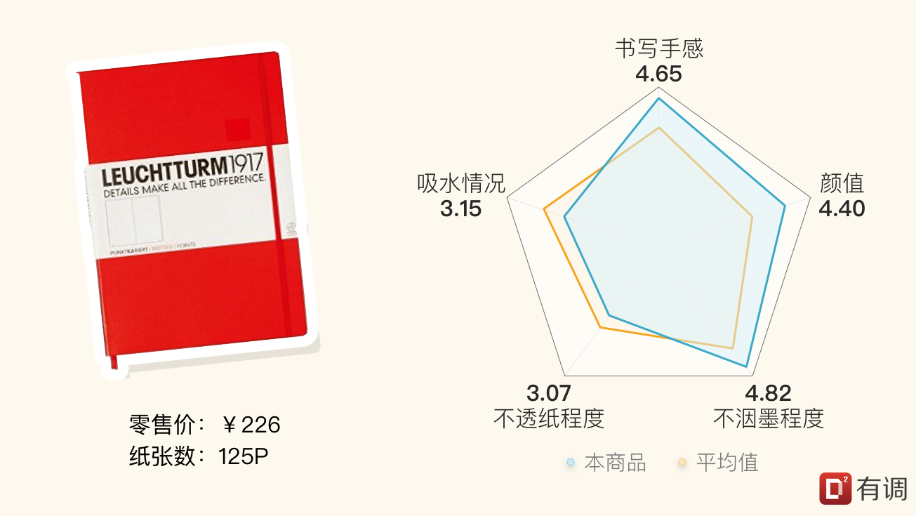 优点:在书写手感、颜值和吸水情况几个维度有较好表现;缺点:不透纸程度和洇墨程度两个维度上有不足。2、Leuchtturm1917 灯塔moleskine笔记本