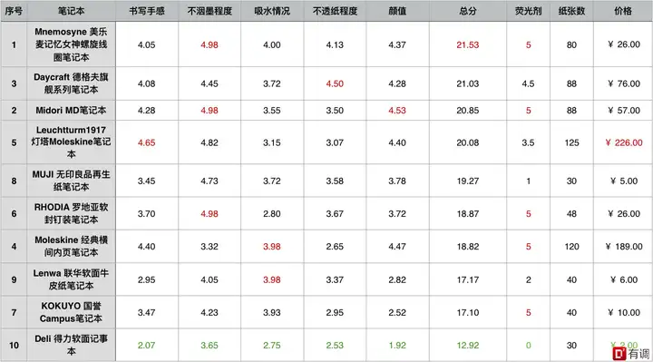 书写手感:灯塔手感最佳,得力手感最差;不洇墨程度美乐麦记忆女神、Midori、罗地亚最不洇墨,得力最洇墨;吸水性:Moleskine和联华吸水性最好,得力吸水性最差;透纸程度:德格夫最不透纸,得力最透纸;颜值:Midori颜值最高,得力颜值最低;荧光剂含量:美乐麦记忆女神、Midori MD、Moleskine、罗地亚、国誉荧光剂含量最少,几乎没有,得力荧光剂含量最多。
