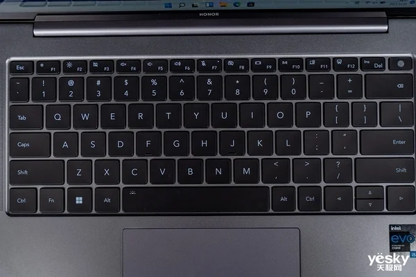 C面依然是传统的键盘区域,荣耀为其配备了1.5mm键程的键盘,不错的键程让打字触发、反馈相当出色。得益于荣耀对键盘区域的充分利用,与游戏本相差无几的键帽面积,保证了编辑文档、各种软件快捷键的准确程度。白色的背光支持两档亮度调节,用户通过Fn+空格键便就可进行切换。