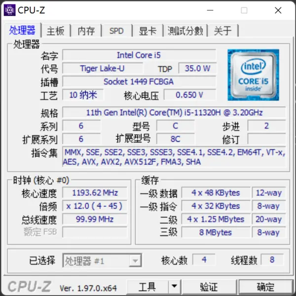 在CPU-Z的基准测试中,英特尔酷睿i5-11320H的单核得分为560.3,多核得分2984.2。
