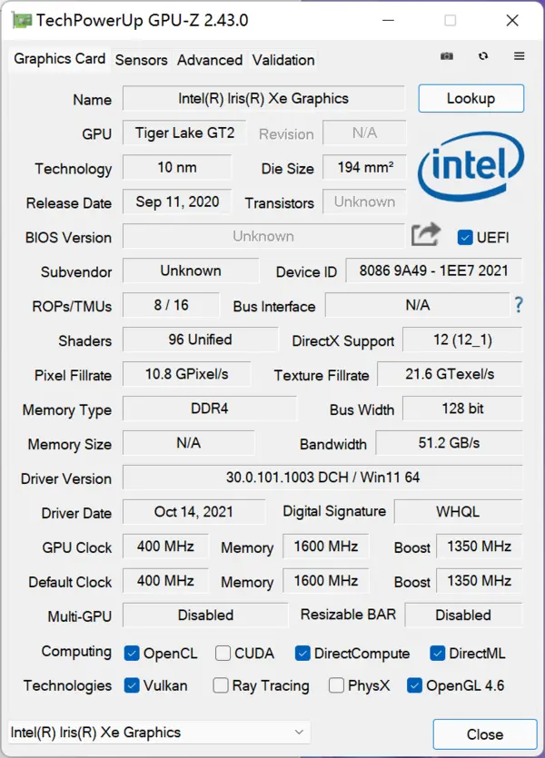 显卡:英特尔Iris Xe Graphics核芯显卡
