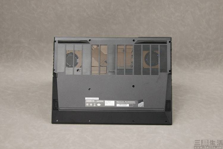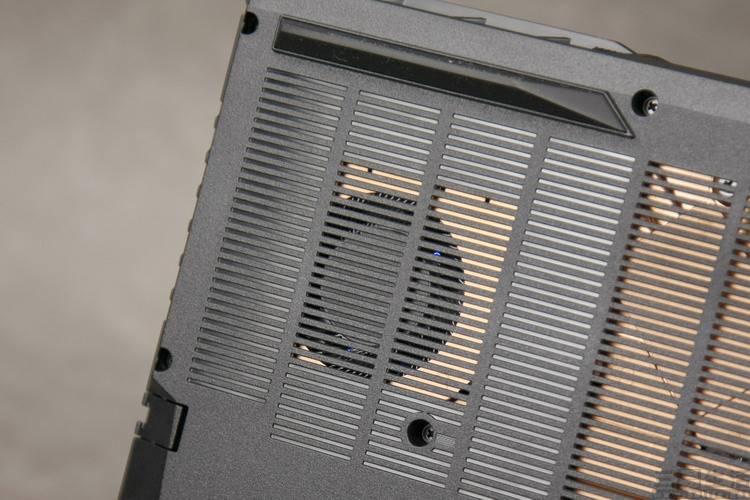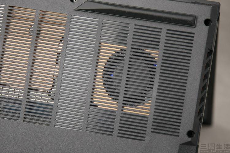 最后在战神TX8R7的D面,透过巨大的进气格栅可以看到“含铜量”极高的大量热管、双风扇散热器,以及大面积的加固铜片。配合侧面和尾部也不难发现,它采用了左右+后方四方向的双风扇、四出风设计,而超大量的铜质鳍片也相当于“明示”了这款笔记本电脑并不简单的性能内涵。