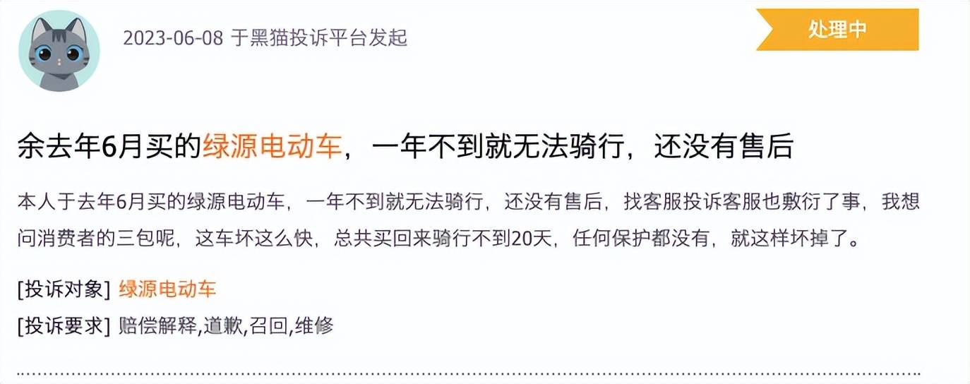 在黑猫投诉平台上,不少消费者投诉绿源电动车质量问题,如新买的电动车后轮的碟刹有异响、电池充不进去电、电池断电等。