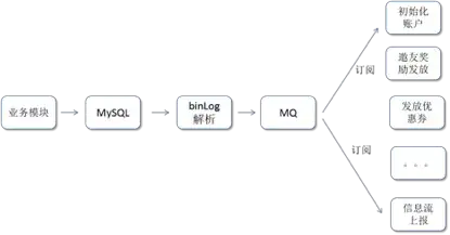 为此,在解耦的过程中通过订阅数据库的 BinLog 日志,开发了一套 BinLog 日志解析模块,专门解析日志,然后生成 JSON 字符串后发送消息到 MQ,下游订阅 MQ 即可。流程如下: